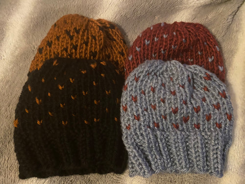 Head coverings for adults , children or babies. Hand knitted and/or crocheted or machine sewn by me. From natural fibers to man made fibers for those with sensitivities to wool, etc.